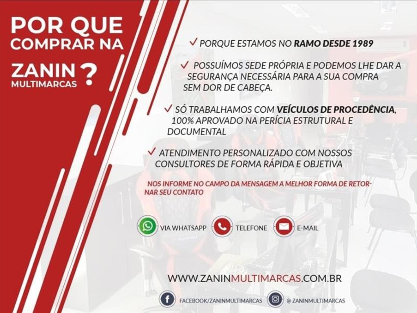 ESTAMOS NO RAMO DESDE 1989, POSSUÍMOS SEDE PRÓPRIA E PODEMOS LHE DAR A SEGURANÇA NECESSÁRIA PARA SUA COMPRA SEM DOR DE CABEÇA. SÓ TRABALHAMOS COM VEÍCULOS DE PROCEDÊNCIA,APROVADO NA PERÍCIA ESTRUTURAL E DOCUMENTAL.ATENDIMENTO PERSONALIZADO COM NOSSOS CONSULTORES, DE FORMA RÁPIDA E OBJETIVA.NOS INFORME NO CAMPO DA MENSAGEM A MELHOR FORMA DE RETORNAR SEU CONTATO.